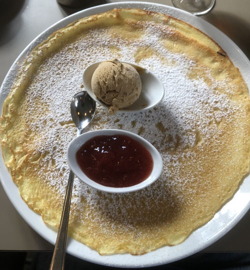Noen kom plutselig på at det hadde da vært veldig godt med litt dessert... Da passet det bra at vi nærmet oss Pannekakehuset. En pannekake med is og et-eller-annet annet fyll er aldri feil. De andre var lure og kjøpte barneporsjon og fikk da en pannekake i "normal størrelse".. jeg gikk for en ordinær fordi jeg selv ville velge fyll (salt karamellis og jordbær). Vi var rimelig sprekkeferdige når vi gikk ut igjen derfra. Når vi senere var innom Smelters Mathus (som er en matbutikk med flere kortreiste matvarer) ble det nesten litt for mye når vi så på utvalget der, men vi fikk med oss litt til å fylle i skapene våre).