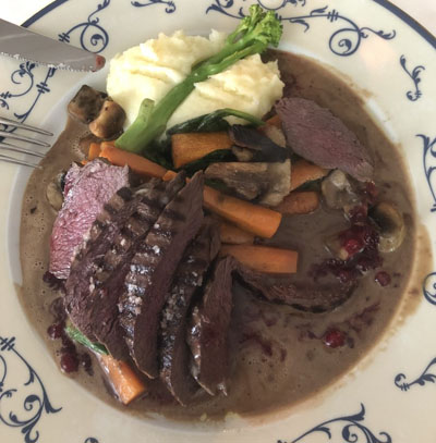 Tanken var å spise lunsj på Værtshuset Bærums Verk som jeg hadde fått anbefalt. Jeg hadde vært i kontakt med de på epost på forhånd, og var blitt anbefalt å reservere bord - men vi liker egentlig å være litt spontane på tur, så da bestemte vi oss på å ta sjansen. Og de hadde heldigvis et nydelig bord for 4 personer ledig. Selve lokalene var veldig koselige, og det er mange som feirer bryllupet sitt her. Mona og Fred Are valgte en kyllingsalat som de begge skrøt veldig av. Det var visst en fin blanding av ingredienser med mange smaker. Rigmor valgte piggvar og ble veldig fornøyd. Jeg gikk for reinsdyrfilet med fløtesaus - det var helt nydelig og fantastisk mør! Litt dyrt var det - men masse mat og vel verdt pengene. Vi var veldig fornøyde og veldig mette da vi takket for oss.