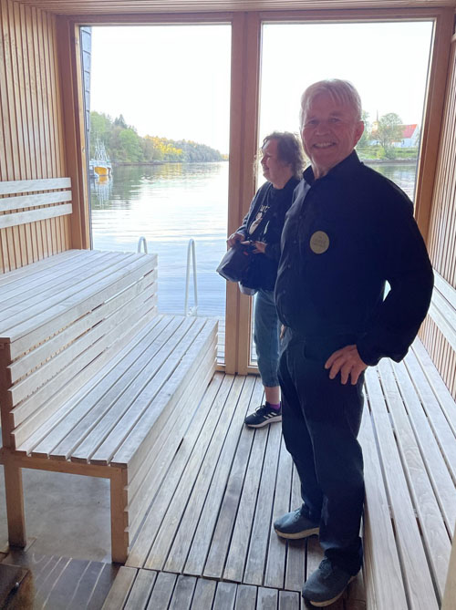 – I 2019 kom kona mi på en idé, og resultatet ser du der, sier han og peker på et lite bygg uti vannet hvor det står Flabellina på et skilt. Det er den eneste flytende og flyttbare kunstbadstuen i hele universet, hevder han.