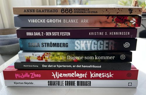 I juli var det denne bunken jeg rakk gjennom: ni bøker fordelt på to krim, fire feelgood, to kokebøker og en quizbok.