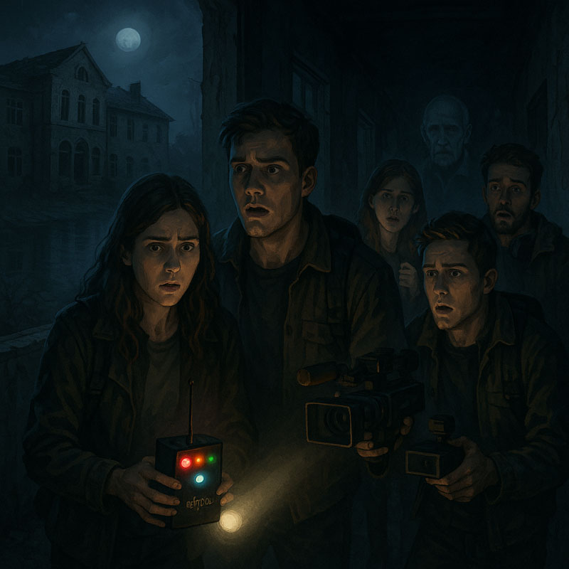 Kamera snur mot Magnus. «Perfekt sted for å kontakte åndeverden», sier han, og peker på utstyret. «Vi har med alt: spiritboks og REM-pod. Følg oss gjennom hele kvelden, kommenter hvis dere ser eller hører noe vi ikke får med oss, og gi oss mange likes. Klarer vi tusen innen en time?»