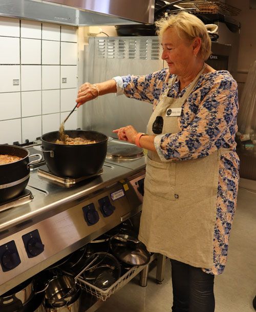 Mary Ann sjekker at dagens pølsegryte er klar for servering