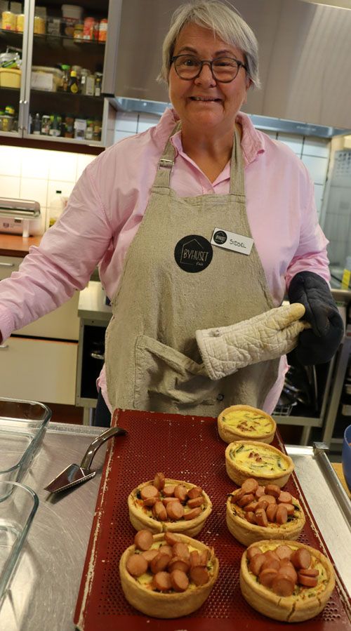 Det er onsdag formiddag, og det regner når jeg besøker Byhuset for å ta en prat med driftsleder Trine Danielsen og frivillig Mary Ann Grytten. Norge har besøk av stormen Hans som herjer rundt dørene, men inne hos Byhuset, er det varmt og tørt. Der blir jeg møtt av fem blide damer. Stemningen er hyggelig, og de småprater mens de gjør alt klart. I dag er det pølsegryte og skinkepai som står på menyen. I tillegg serveres det snitter og matpakker.