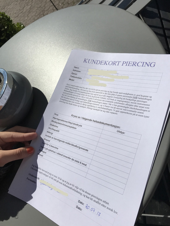 Først måtte hun fylle ut en kundeerklæring med informasjon om eventuelle sykdommer.