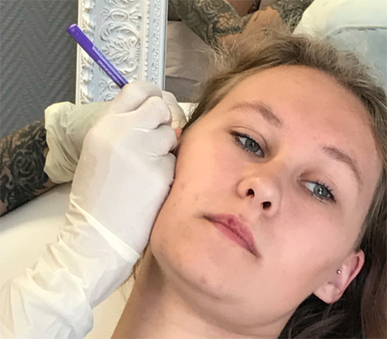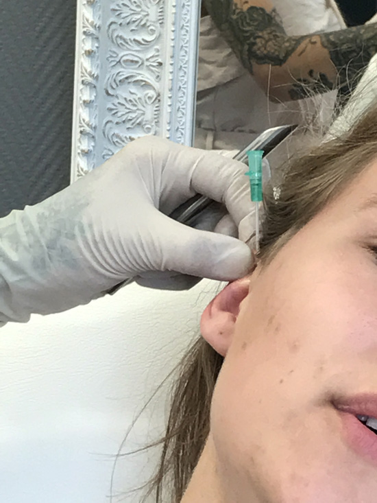 Deretter merket hun opp hvor piercingen skulle være. Datteren samtykket i at piercingen kunne settes der Susanne syntes det ble finest med tanke på anatomien i øre.