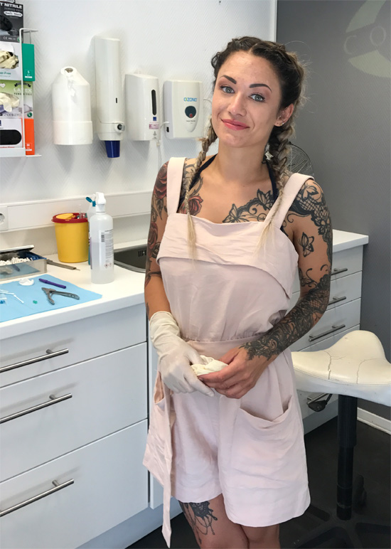 Etter en stund ble hun ropt opp og vi gikk inn i behandlingsrommet. Det var daglig leder og piercingartist, Susanne Yvonn Pettersen som skulle sette piercingen. Contrast Ink Tattoo setter store krav til hygiene med regler og rutiner. I utgangspunktet får ingen være med inn. Det ble gjort et unntak siden jeg skulle skrive artikkel. Det brukes kun sterile titansmykker og sterilt utstyr under behandling.