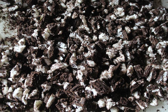 Ha 2 pakker med oreokjeks (en og en halv oreokjeks - pakke) i en pose. Knyt den og knus kjeksene ved å bruke en kjevle.