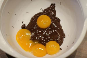 Finn fram en ny bolle og bland eggeplomene og sjokoladen sammen.