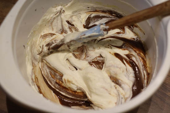 Etter 7 t kan du ta spingformen ut av fryseren igjen og ha sjokolademoussen over oreoisen. Sett den inn i fryseren igjen og la den stå der i 1 t før du legger på pynten.