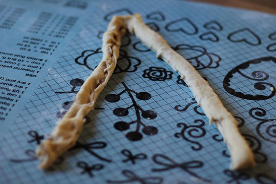 Kutt deigen i 20 like store strimler med en kniv som du kan se på bildet over.