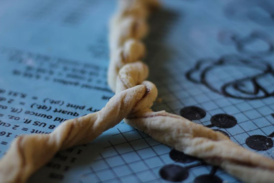 Flett så disse to små strimlene sammen. Dette gjøres ved å snurre de rundt under hverandre annenhver gang.