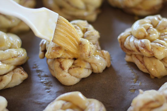 Klekk et egg i en kopp og bruk en bakepensel til å pensle kanelsnurrene.