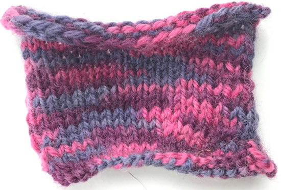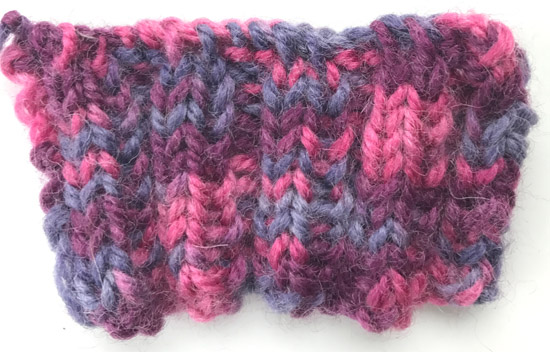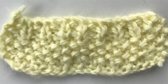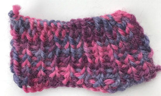 Perlestrikk (1 rett, 1 vrang. Motsatt vei på pinne 2):