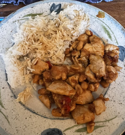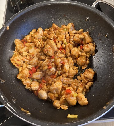En rett jeg ofte har spist på diverse kinarestauranter er Kylling Gonbao, og den fantes i denne boka. Da var det jo bare å sette i gang. Her i byen har vi fått en ganske ny og veldig stor asiatisk butikk, så jeg dro ned med handleliste. På den var det ukjente ingredienser, som f.eks. Chingkiang-eddik. Jeg fant det jeg skulle ha. Jeg hadde nok håpet på å finne ferdig Sichuan-pepper, men der måtte jeg fram med morteren.. og det var kanskje da det gikk feil. Retten ble sterk! Eller var jeg kanskje litt for rundhåndet med chili-pasten.