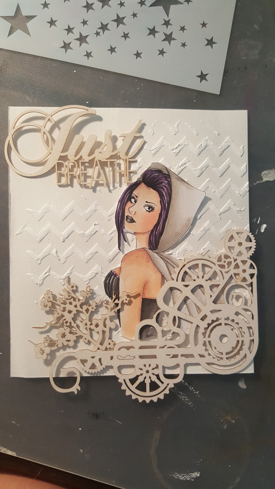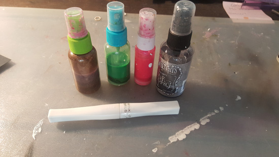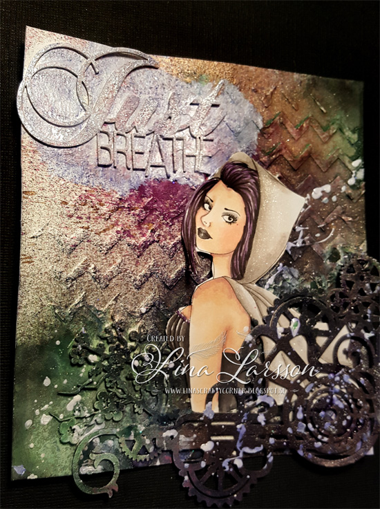 I det här skedet sprayar jag hejvilt och blir jag inte nöjd så sprayar jag lite till ;) Det viktiga är att inte tänka så mycket och var orädd. Det kan inte bli fel. när allt har torkat fäster jag mitt stämpelmotiv och målar detaljerna med min wink of stella :)