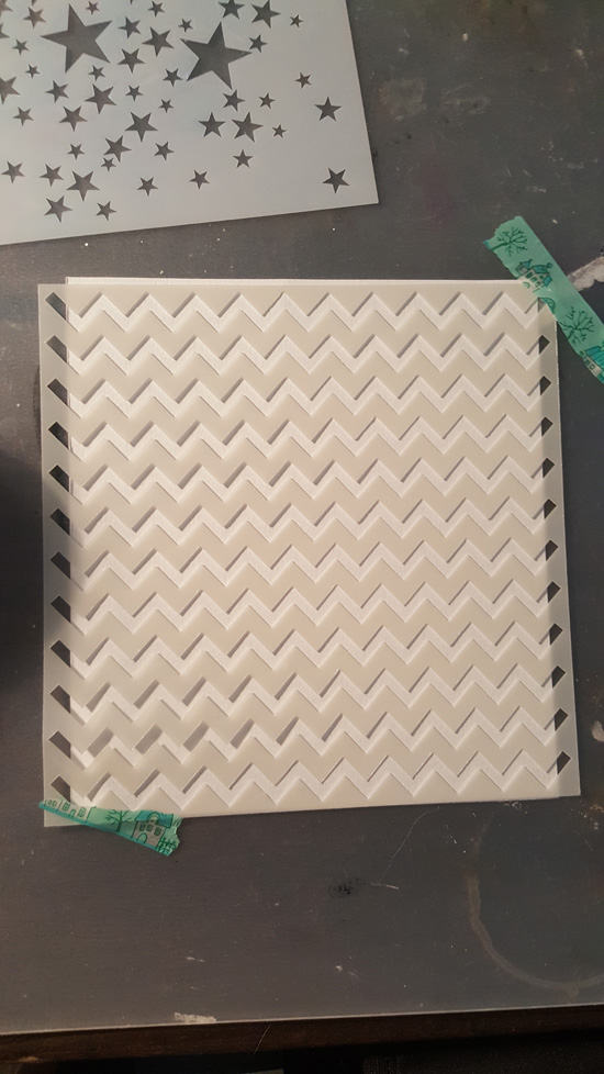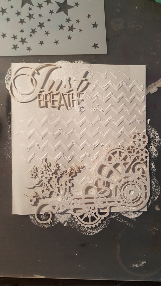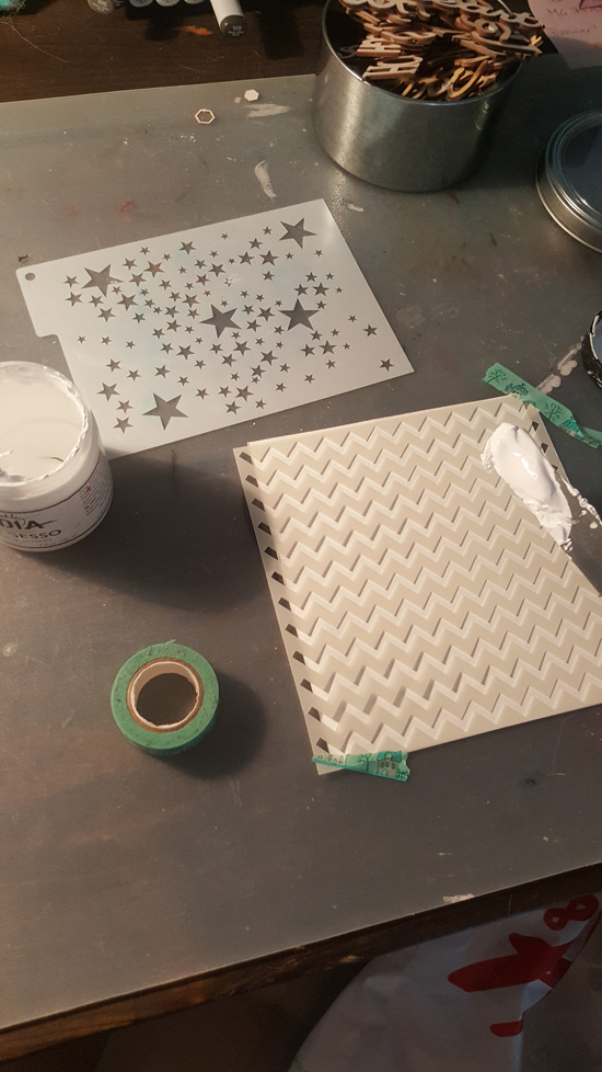 Börja med en stencil och vit geso. Jag har dåligt tålamod så jag brukar torka allt med embossingfön så det ska gå lite fortare. Sen limmar jag fast de övriga dekorationerna och målar allt med vit geso eller akrylfärg.