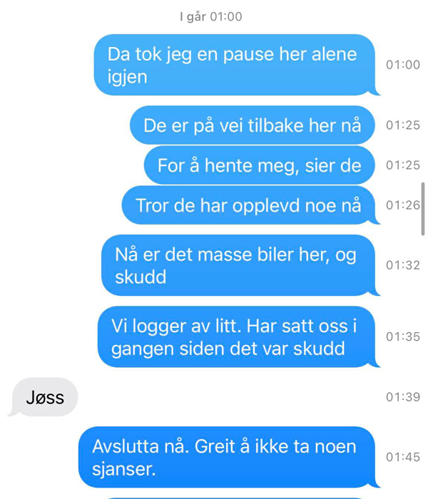 Klokka 01 takket Marita for seg, og jeg tok meg "ladepause" i administrasjonbygget, mens Kent og Roar gikk en liten tur tilbake til hovedbygget. Mindre enn 6 minutter etter at de kom tilbake til basen vår, hørte vi skudd veldig nært bygningen vi oppholdt oss i. Utenfor sto en bil, og en annen kom kjørende i stor fart bort fra det rosa bygget. Av sikkerhetsmessige grunner, avsluttet vi derfor livesendingen en stund før planlagt.