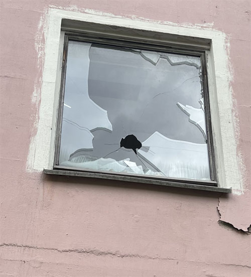Bildetekst: Knust vindu i det rosa huset. Glasskår både ute og inne. (Ikke så synlig på bildene)