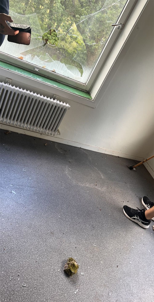 Dagen etter oppdaget vi at også et vindu i det rosa huset var blitt knust med en stein i løpet av natta. Alt er fanget på video.