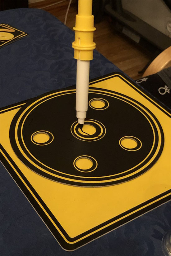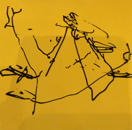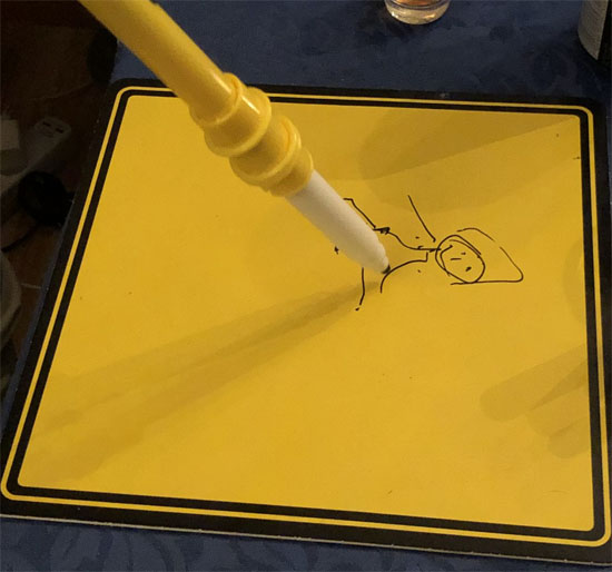 Før du tenker at dette kan da umulig være så vanskelig, så må jeg fortelle deg, at du også må trekke kort som bestemmer hvordan du skal holde pennen. Tegneidéen man kommer opp med, blir ikke alltid som du ser for deg. Her kan du risikere å måtte holde pennen i tuppen, som er en veldig myk del. Da skal jeg love at det er vanskelig å bevege den.