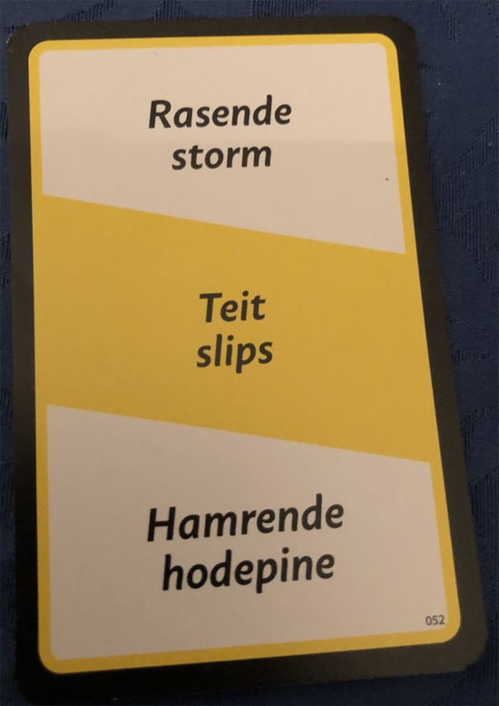 Det er mange vanskelige ord, og det gjør det ekstra moro. Det kom alltid mange kreative og noen rare forslag, dette utløste stadig latterutbrudd i spillegjengen. For det er ikke opplagt at det er lett å tegne ord som fylt paprika, sint krokodille, halvspist gulrot, skummende svamp, teit slips, kort skjørt og bandasjert tå som et eksempel på det vi fikk.