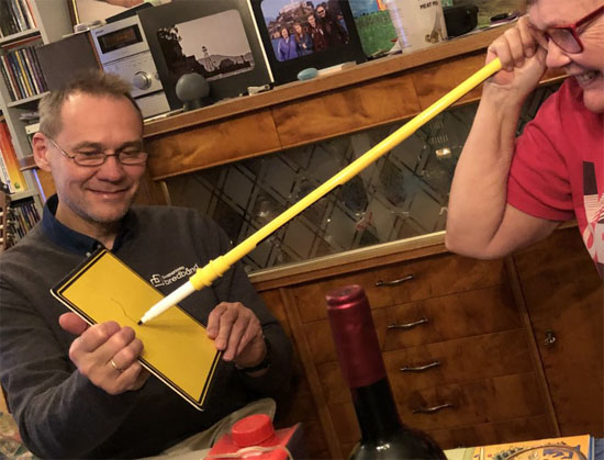 Til vår store glede fikk Rigmor stadig det kortet som sa at man måtte stå og holde pennen mellom beina når man tegnet. Anders måtte stadig holde pennen bak øra, du kan også risikere å måtte holde den andre armen opp i lufta - og det ulitmate må være når du får kortet som sier at du skal legge en plate over det du tegner. Da har du bare noen små åpninger hvor både du og de andre skal se det du tegner.